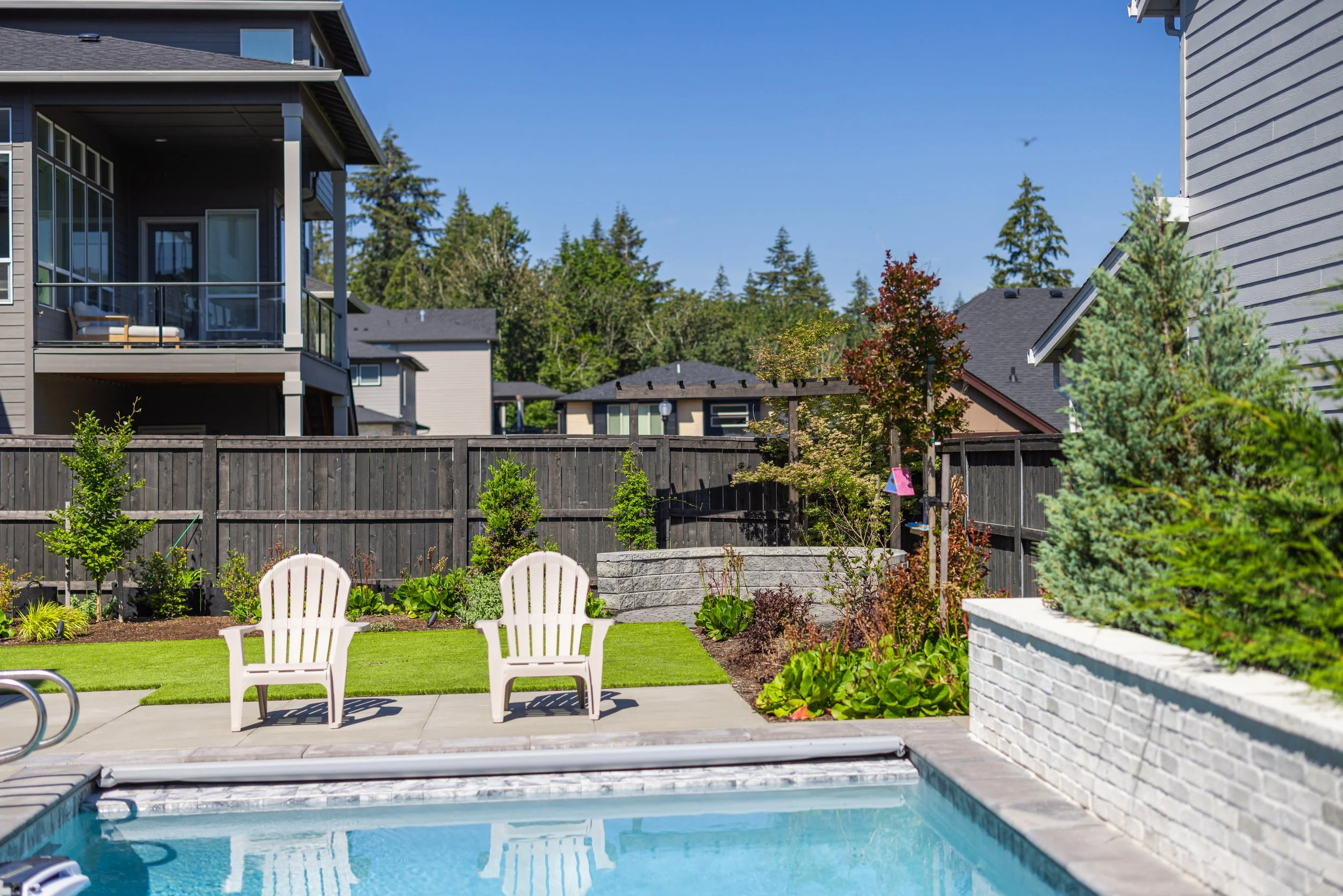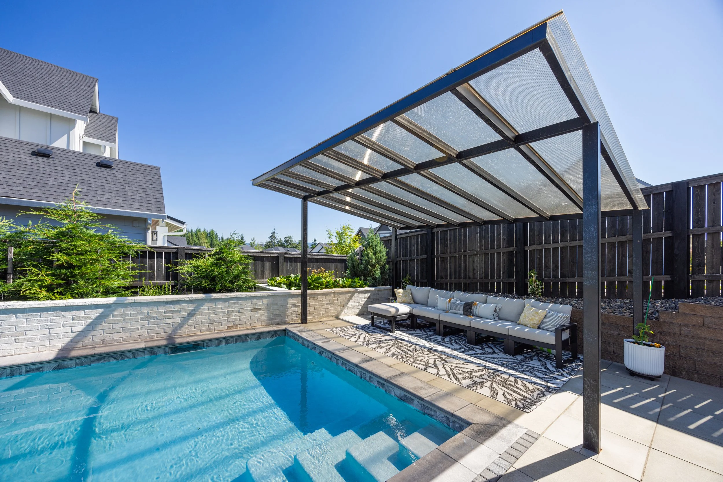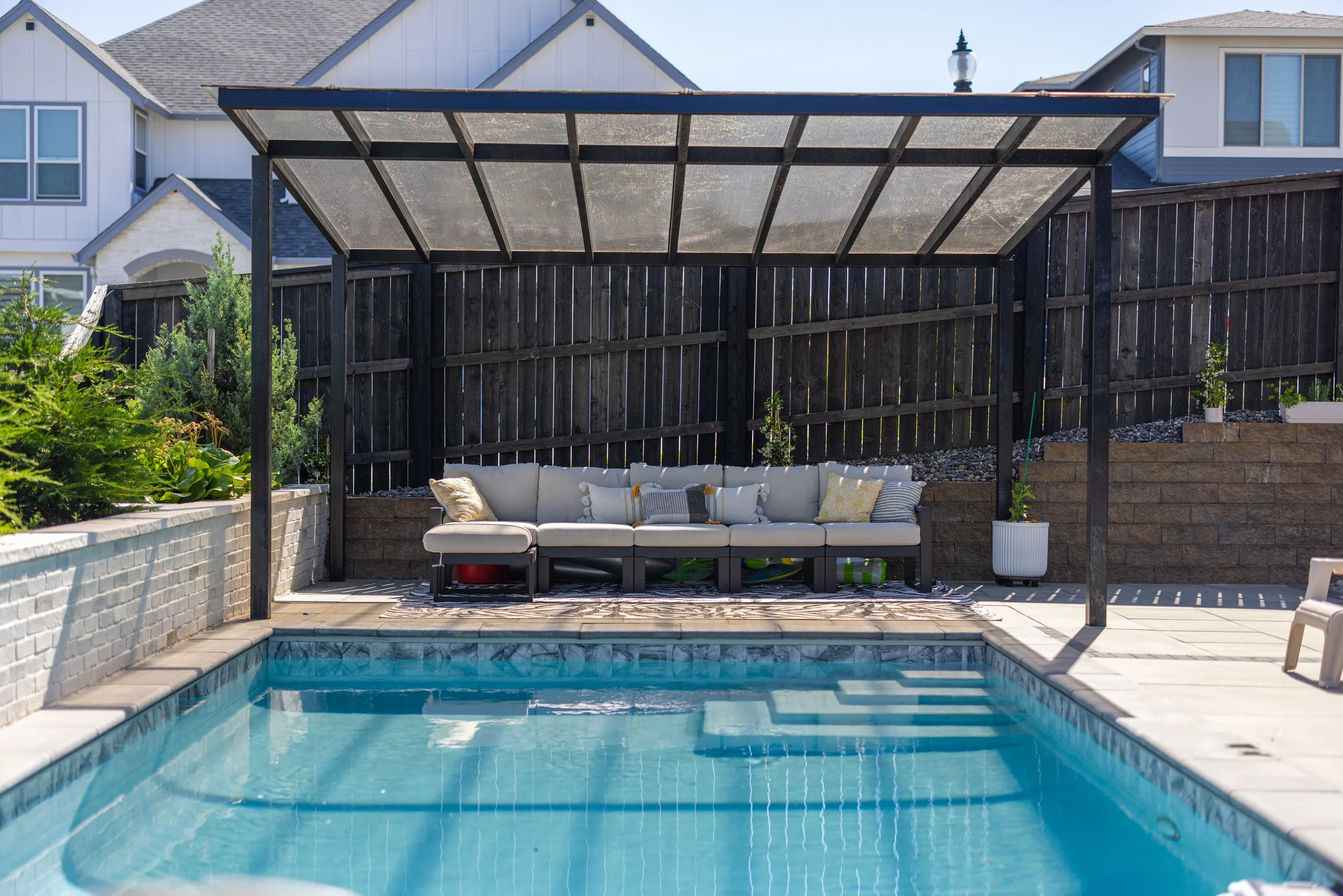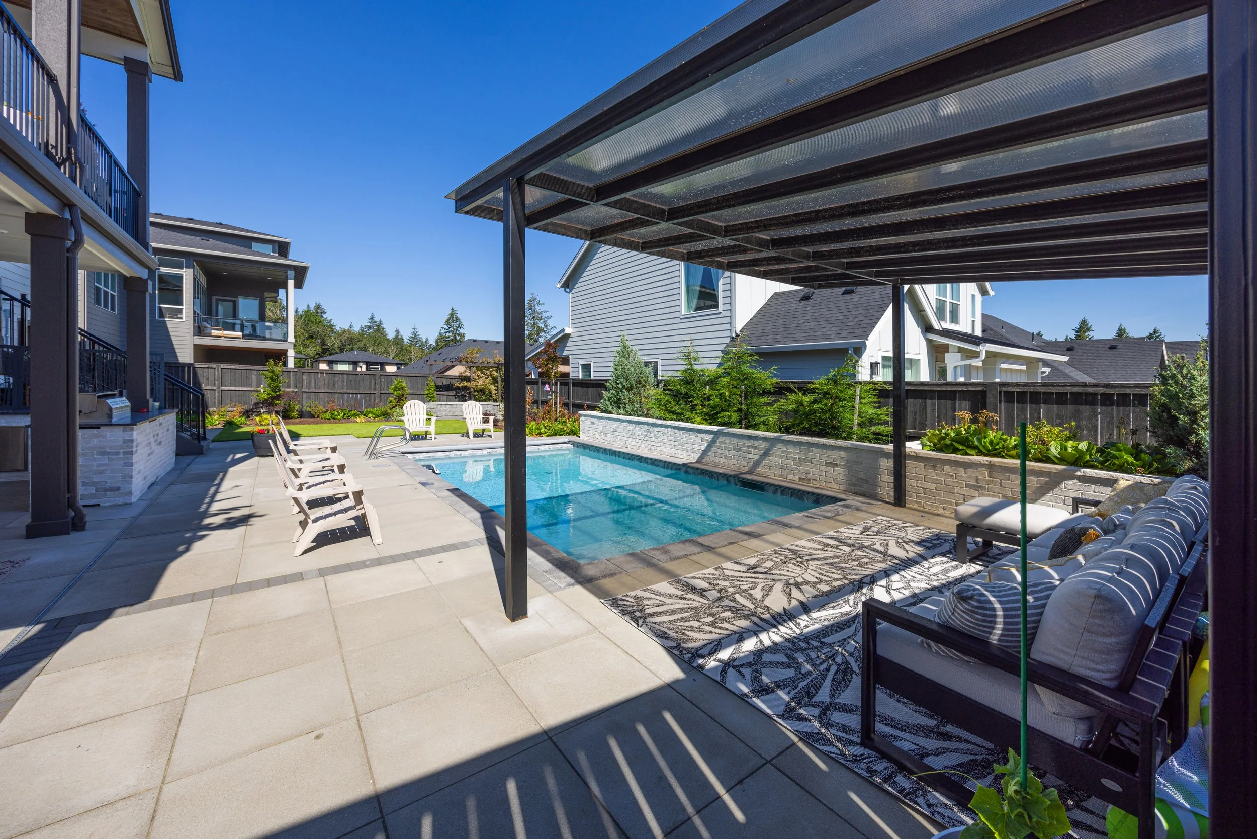Custom Pool & Masonry Surround – A stunning inground pool integrated with heavy masonry walls that provide structural definition and a high-end aesthetic.