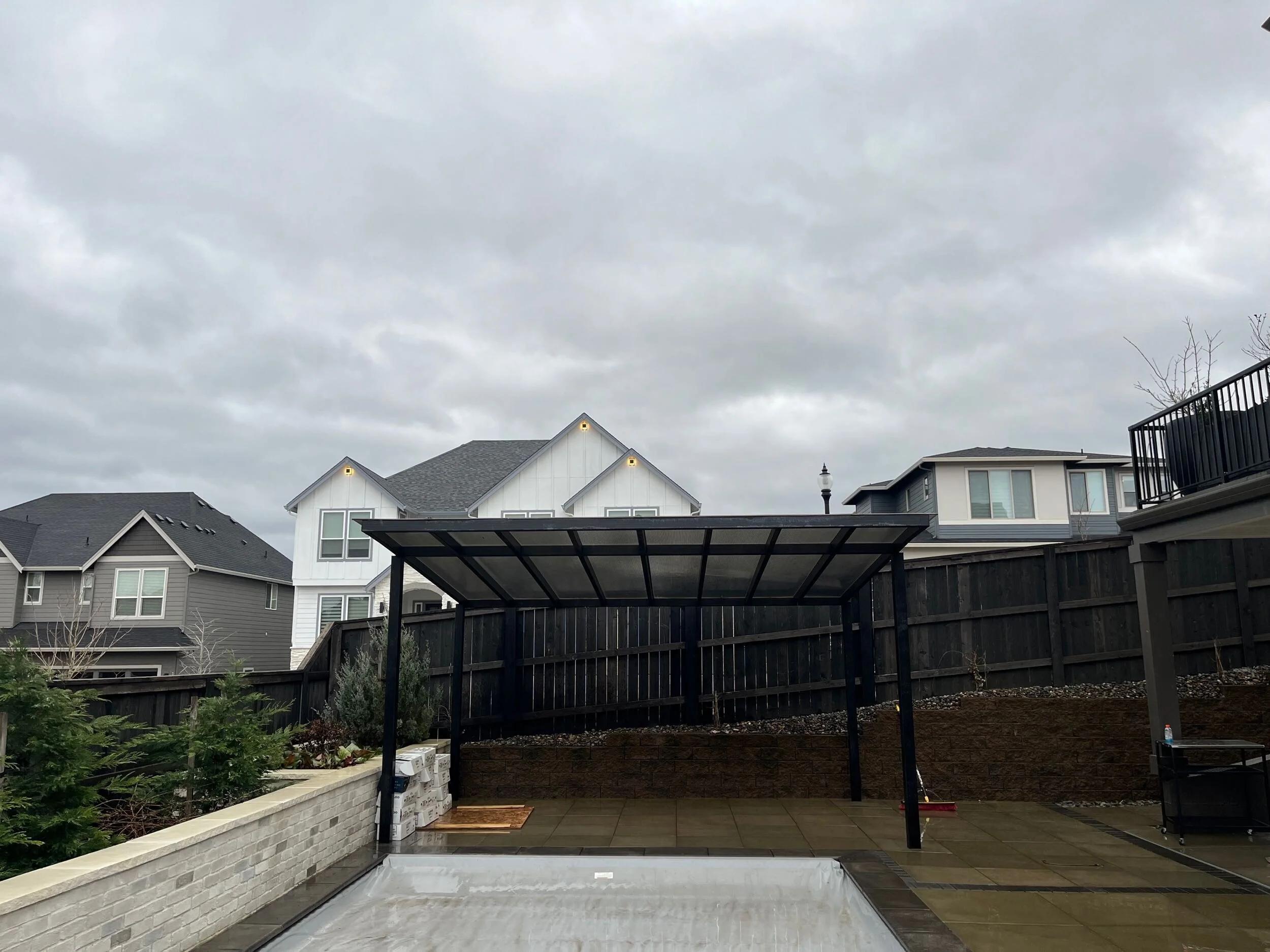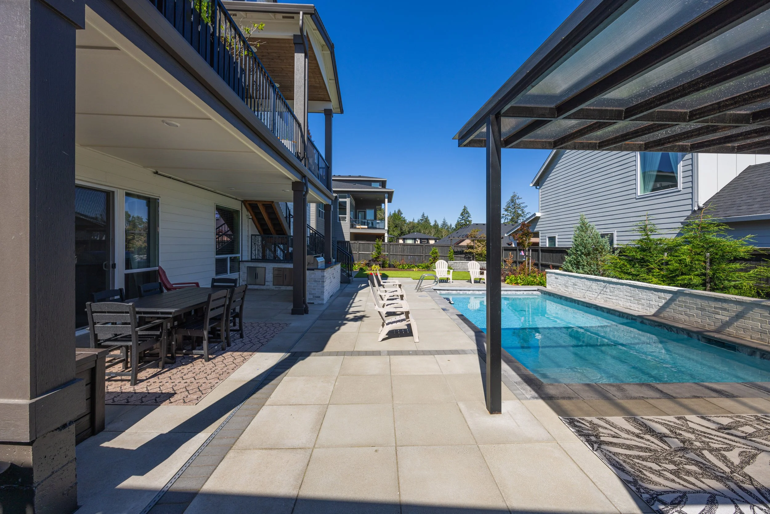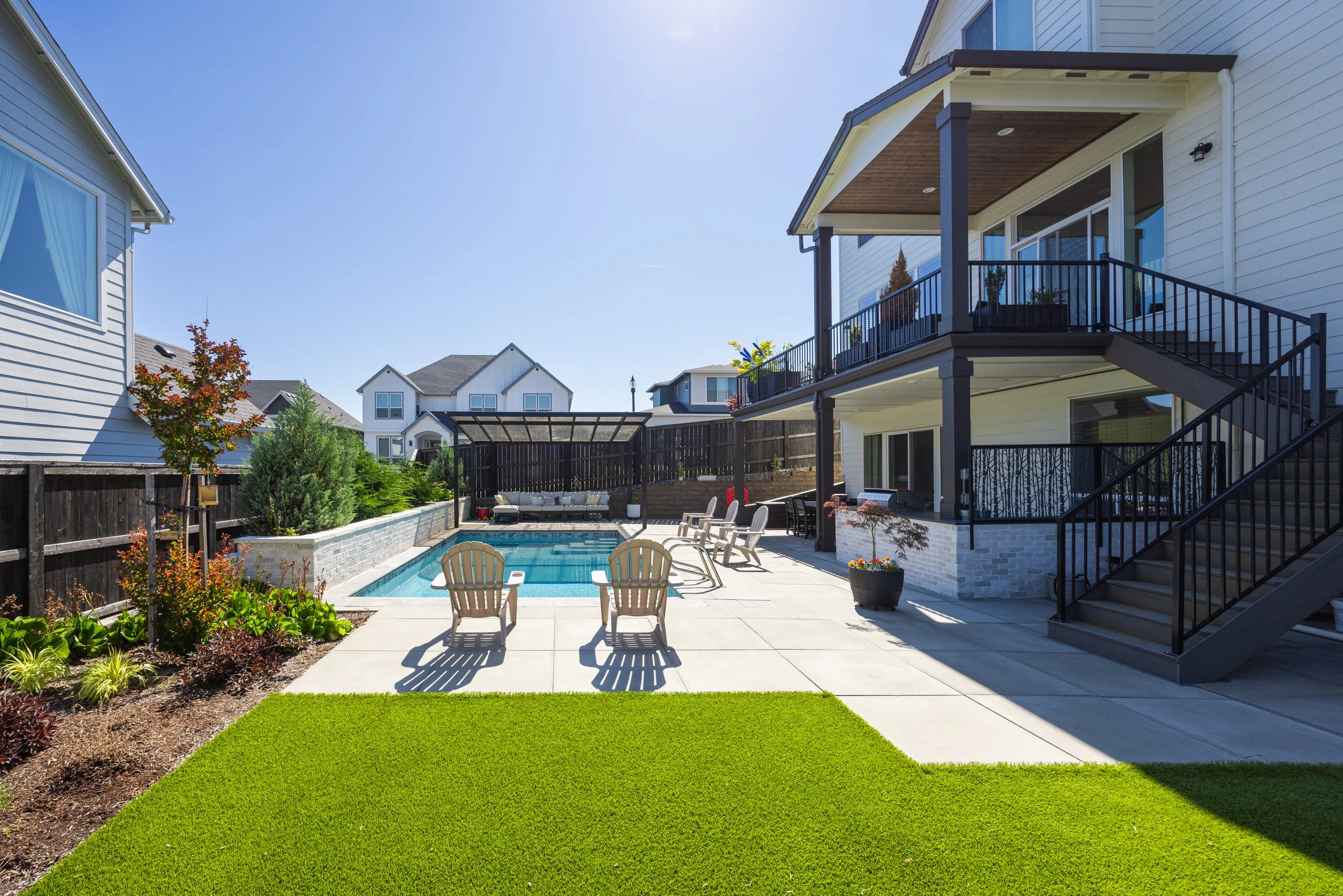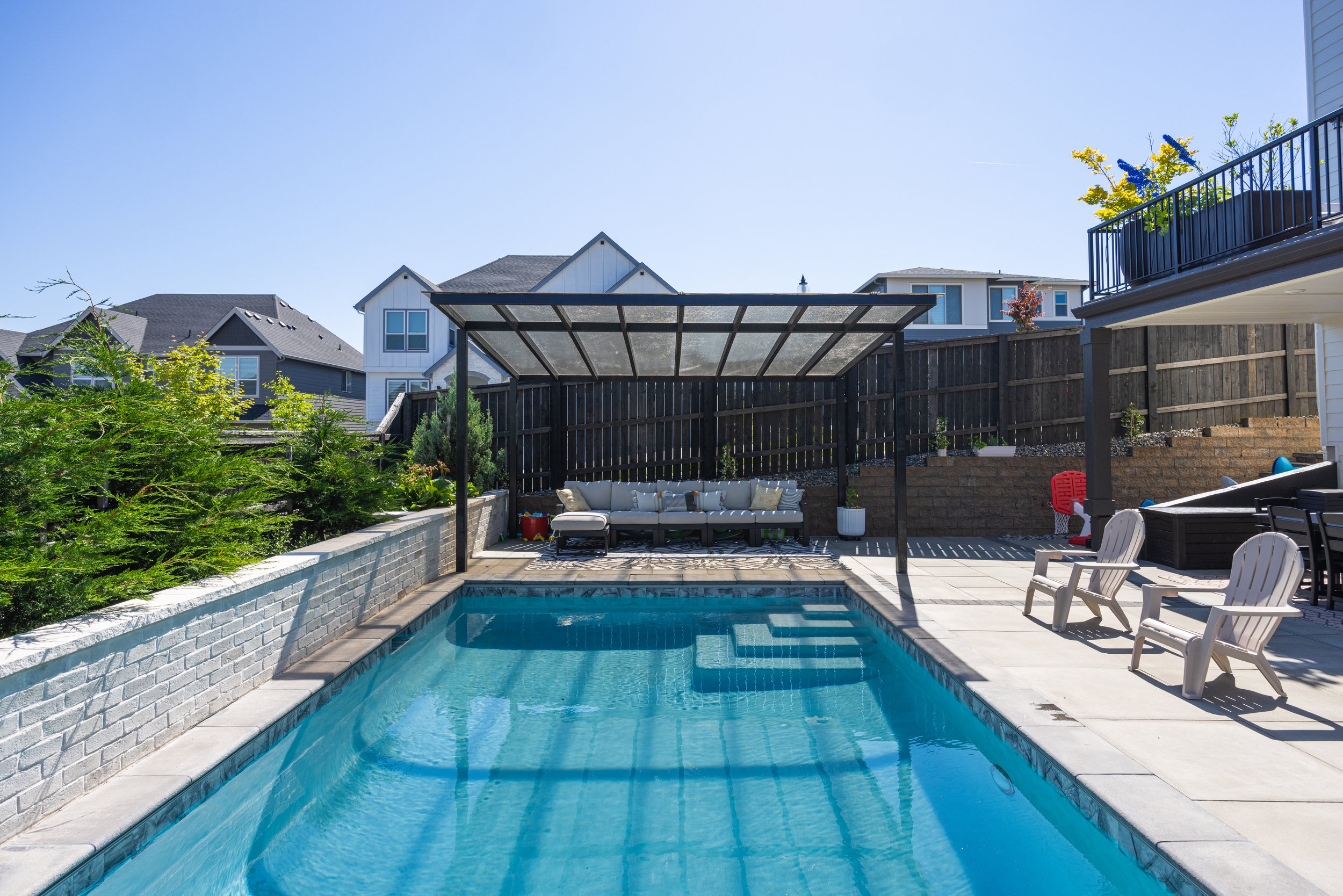 Custom Pool & Masonry Surround – A stunning inground pool integrated with heavy masonry walls that provide structural definition and a high-end aesthetic.