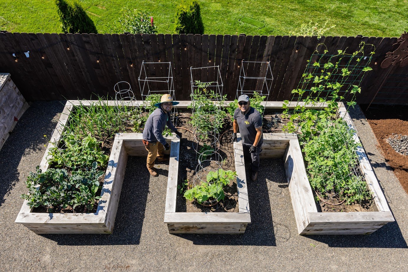 Our outdoor living design team kicked off the project by developing an implementation strategy for the garden carpentry team, who used premium materials to build numerous outdoor structures to anchor the design, including raised planter boxes, a hot tub enclosure, and a custom utility shed. Next, our staff laid out, prepped, and installed the beautiful free-form hardscapes to make the area easily accessible, weaving curvilinear lines to harmonize with the landscaping and soft scapes – resulting in functional space and the perfect backyard relaxation habitat for the owners.